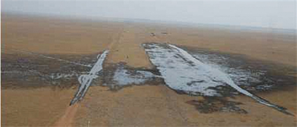 (1)環(huán)境影響。自然保護(hù)區(qū)內(nèi)地面油品污染面積為50000 m2(5公頃),如圖 2所示,受污染的草原植被被鏟除。地下水位于9 m~12 m之間,鉆孔進(jìn)行了一系列巖芯樣本以及地面樣本分析。泄漏發(fā)生后一個(gè)月內(nèi)安裝了72組監(jiān)測(cè)裝置監(jiān)測(cè)地下水的污染情況,還建立了一道水力屏障,以遏制油品的遷移。通過(guò)定期監(jiān)測(cè)分析表明,灌溉、人類和動(dòng)物飲用未受到影響。