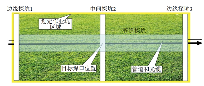埋地油氣管道進(jìn)行維修作業(yè)時(shí)需要開(kāi)挖作業(yè)坑將管道露出,由于伴行光纜位置不明確,開(kāi)挖時(shí)存在損傷光纜的風(fēng)險(xiǎn)。在某管道環(huán)焊縫排查中,通過(guò)采取“王字型”作業(yè)坑開(kāi)挖方式,有效保護(hù)了光纜的安全。