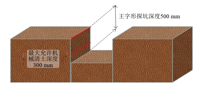 “王字型”開(kāi)挖。早期使用“工字型”即兩橫一豎探坑開(kāi)挖方式,對(duì)于地下隱蔽工程埋深起伏較大的地段,不能及時(shí)探出隱蔽工程,如圖 1所示。
