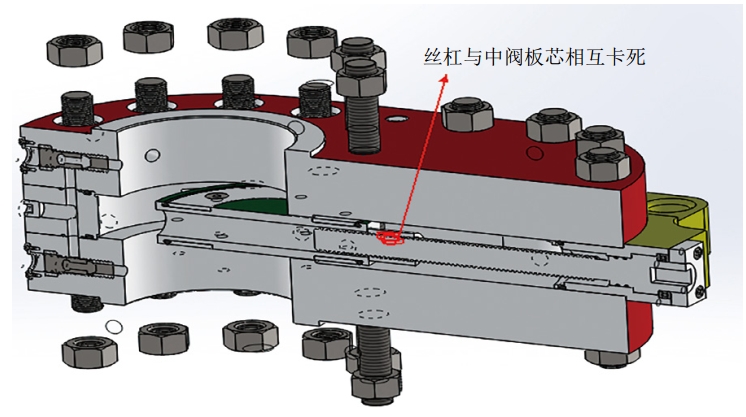 重新擰緊絲杠壓蓋,將頂杠向后松動(dòng)7 mm,逐漸松開絲杠壓蓋螺栓,發(fā)現(xiàn)絲杠隨螺栓松動(dòng)向后面移動(dòng)。此現(xiàn)象說(shuō)明中閥板芯沒有被上下閥板卡住,在有力的作用下可以使其移動(dòng)。