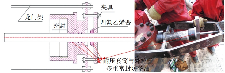 結(jié)合帶液壓缸的閘閥開啟結(jié)構(gòu)形式,“以拉代旋”將中閥板拉拽出來(lái)。通過(guò)在閥門外部安裝龍門架,在絲杠外端部攻絲以延長(zhǎng)連接外拉桿,利用桿將閥門絲杠和中閥板同時(shí)拉出方法打開閥門,完成安裝三通內(nèi)塞柄的工序。此方法要保證閥門內(nèi)腔的密閉性,操作全過(guò)程不得出現(xiàn)油氣介質(zhì)泄漏,對(duì)可能的泄漏點(diǎn)進(jìn)行多重密封保護(hù)。