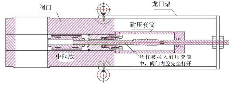 聯(lián)通耐壓套筒和管道,使兩者壓力平衡。觀察整個(gè)裝置的各個(gè)連接點(diǎn),用肥皂水檢查氣密性。確保無(wú)泄漏后,通過(guò)旋轉(zhuǎn)頂杠上部的螺母,緩慢將閥門絲杠拉出,從而打開中閥板(在龍門架的外拉桿上做好中閥板抽出的起始標(biāo)記,隨時(shí)時(shí)測(cè)量抽出的尺寸,直至達(dá)到最終值),如圖 3所示。