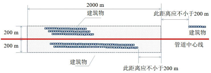 畫一個400 m×2000 m矩形框,在管道中心線沿軸向任意移動,矩形框的兩條400 m短邊距離框內外最近建筑物不應小于200 m,統(tǒng)計框內的住戶數(shù)量,兩端間管道則為高后果區(qū),滿足規(guī)范規(guī)定的哪個條件就劃為哪個等級,簡單易操作(圖 1)。