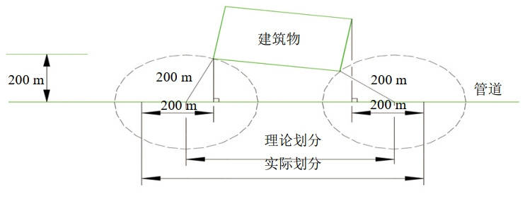 居民類構建筑物具體確定高后果區(qū)邊界時,按照規(guī)范要求,應在管道中心線上畫一個200 m半徑的圓,當圓弧與構建筑物相接時,圓心距為高后果區(qū)的長度,如圖 2中理論劃分。這樣的識別方法嚴謹,但實際操作難度很大,需將管道路由、構建筑物和兩者相對關系嚴格按比例繪圖,再用上述辦法畫圓,按比例推算圓心位置,確定高后果區(qū)長度。在建設期識別時有圖紙可依托,基本可實現(xiàn),但在運行期當構建筑物與原設計圖紙發(fā)生變化后,生產運行單位需要重新調繪管道周邊信息,按照比例繪制圖紙,精度要求高,難度大,不易實現(xiàn)。