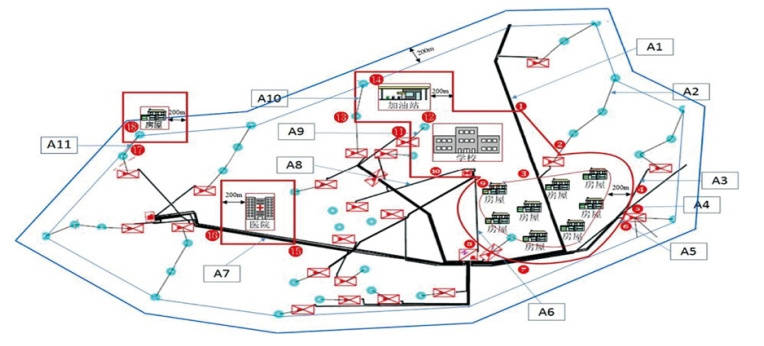 油田集輸油管道大部分呈現(xiàn)為支狀、網(wǎng)狀結構,高后果區(qū)識別難度較大,通過實踐總結,形成了符合油氣田特點的區(qū)域識別法(圖 4)。根據(jù)管網(wǎng)年代、環(huán)境、介質、管材等主要風險因素,以平滑曲線連接邊界,將邊界線以平行趨勢向外延伸200 m,以延伸后的邊界線包含區(qū)域作為一個識別單位,統(tǒng)計管網(wǎng)單元內的特定場所、易燃易爆場所、人口密集區(qū)及該場所200 m范圍內包含的管道或管段,此管道或管段即為高后果區(qū)管道。