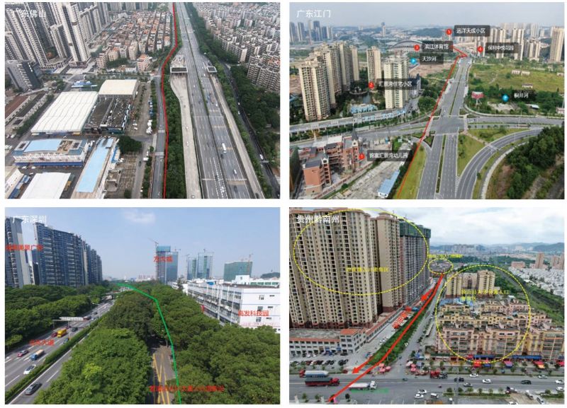 華南公司目前管轄廣東、廣西、貴州、云南、四川、重慶等6省市6000余公里成品油管道,2023年識別高后果區(qū)1163處、高后果區(qū)里程約1358公里,占比約22%,其中廣東地區(qū)高后果區(qū)總數(shù)540處、里程792公里,占比約43%,均明顯高于西南其他省市(圖 1);此外,廣東深圳、廣州、東莞、佛山、中山、珠海、江門、貴州黔南州、貴陽等地區(qū)部分管道穿越城區(qū),管道周邊密集分布大型住宅社區(qū)、寫字樓等人員密集場所(圖 2),高后果區(qū)風(fēng)險管控難度大。