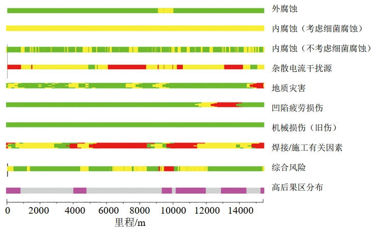 通過開展“管道大摸底、隱患大排查、管理大提升”活動,全面完成內(nèi)外檢測、地災(zāi)排查、高后果區(qū)再識別等“體檢”,匯編成公司管道管理數(shù)據(jù)手冊、水系圖和事故案例集。完成了高后果區(qū)重點風(fēng)險因素梳理,開展了以樁號/里程為基準(zhǔn)的管道內(nèi)外部重點風(fēng)險對齊和管道綜合風(fēng)險分析與評價。根據(jù)數(shù)據(jù)對齊和風(fēng)險評價結(jié)果,制作11項重點業(yè)務(wù)管理看板,采取“掛圖作戰(zhàn)”一表式推進問題整改。以坪山—媽灣為例,通過內(nèi)外檢測雜散電流干擾、地質(zhì)災(zāi)害、管道焊接/施工有關(guān)因素(管道底片)、管道第三方施工(機械損傷)等數(shù)據(jù)對齊(圖 3),識別出該段管道高后果區(qū)較突出的風(fēng)險為與焊接施工有關(guān)因素和雜散電流干擾因素。完成了高后果區(qū)范圍高失效可能性的23處環(huán)焊縫缺陷修復(fù),對雜散電流干擾進行了治理。針對處于高后果區(qū)的中等失效風(fēng)險,制定三年分級治理策略,逐年推行風(fēng)險降級。同時,根據(jù)對齊結(jié)果,加強高后果區(qū)重點風(fēng)險的感知與預(yù)警,彌補人工巡檢時效性和可靠性不足的問題。在高后果區(qū)中等失效可能的某閥室安裝部署無人機機庫,日?蛇M行以閥室為中心點的4條線路巡檢,全面覆蓋9.7 km的重點高后果區(qū),常態(tài)化全天候開展16架次/天的巡檢工作,對第三方施工作業(yè)、地質(zhì)災(zāi)害等異常目標(biāo)實時識別和預(yù)警。