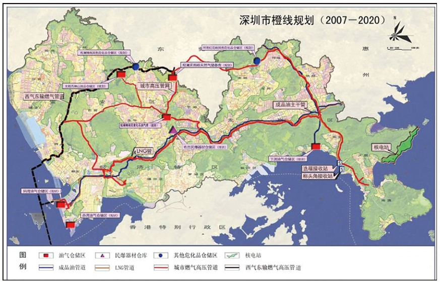 (1)首次提出城市“橙線”概念。為降低城市重大危險(xiǎn)設(shè)施的風(fēng)險(xiǎn)水平,深圳市城市規(guī)劃委員會2009年第一次會議原則審批通過深圳市橙線規(guī)劃(2007—2020)。城市“橙線”是對全市重大危險(xiǎn)設(shè)施周邊區(qū)域的土地利用和建設(shè)活動進(jìn)行引導(dǎo)或限制的安全防護(hù)范圍的控制界線。其中結(jié)合油氣長輸管道實(shí)際情況,將油氣長輸管道周邊區(qū)域的安全防護(hù)范圍分為控制區(qū)、限制區(qū)、影響區(qū)。控制區(qū)范圍內(nèi)除市政設(shè)施、交通設(shè)施(專指道路及場地,不包括建筑)外,禁止規(guī)劃建設(shè)其它設(shè)施;限制區(qū)范圍內(nèi)除影響區(qū)禁止規(guī)劃建設(shè)的設(shè)施外,不得規(guī)劃建設(shè)住宅、宿舍、私人自建房、商業(yè)、商務(wù)公寓、大型廠房 、研發(fā)用房、辦公、其他配套輔助設(shè)施;影響區(qū)范圍內(nèi)不得規(guī)劃建設(shè)幼兒園(托兒所)、游樂設(shè)施、文化設(shè)施、文化遺產(chǎn)、體育設(shè)施、醫(yī)療衛(wèi)生設(shè)施、教育設(shè)施、宗教設(shè)施、社會福利設(shè)施、特殊建筑。由于“橙線”劃定涉及社會多個(gè)方面,推進(jìn)過程中難免存在各種利益沖突,有許多矛盾和問題需要解決,但仍不失為一種大膽和有益的探索(該規(guī)劃已過有效期,目前已失效)。