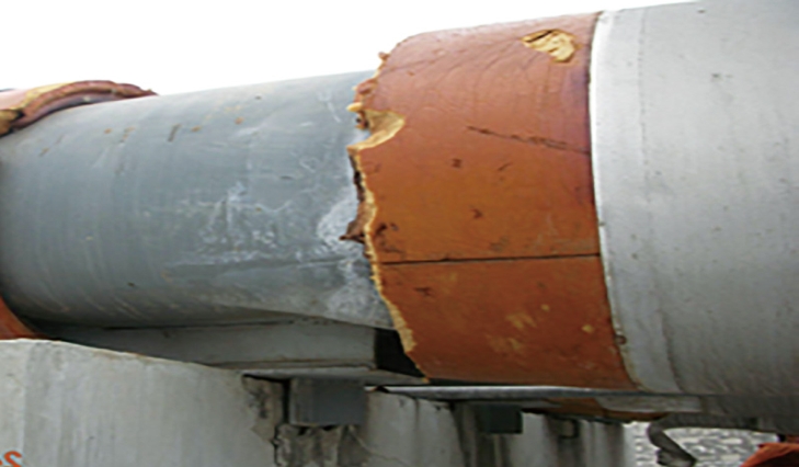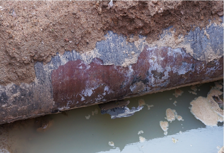 (1)管道防腐層破損。對(duì)事故管道開(kāi)挖發(fā)現(xiàn)瀝青玻璃布防腐層破損、脫落嚴(yán)重,管道外壁大面積直接暴露在自然環(huán)境中(圖 2)。在東黃復(fù)線管道建設(shè)期,尚未普及三層PE管道外防腐技術(shù),瀝青玻璃布防腐效果不佳。