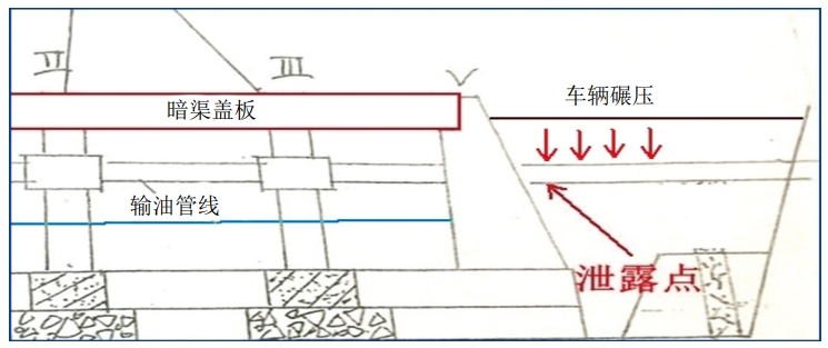 排水渠的建設(shè)在管道之后,由早期的明渠后來(lái)加蓋成為暗渠。排水渠在秦皇島路與齋堂島街的“丁”字路口處建設(shè)了橋涵,管道沿秦皇島路在橋涵蓋板下穿過(guò)水渠。根據(jù)施工說(shuō)明,在路口開(kāi)挖寬度為56 m、中部深度5.3 m的橋涵基坑,橋涵建成后填土掩埋橋涵外側(cè)管道。秦皇島路的建設(shè)也在管道之后,道路與管道相同路由,管道大部分在道路的隔離帶下方,但是路口處的管道不能避免車(chē)輛碾壓,尤其是在秦皇島路建設(shè)期間管道上方土層薄、施工車(chē)輛重對(duì)管道的損傷難以避免。在當(dāng)年手繪的排水渠橋涵施工圖上后來(lái)又標(biāo)注了暗渠蓋板、車(chē)輛碾壓和泄漏點(diǎn)等信息(圖 3)。