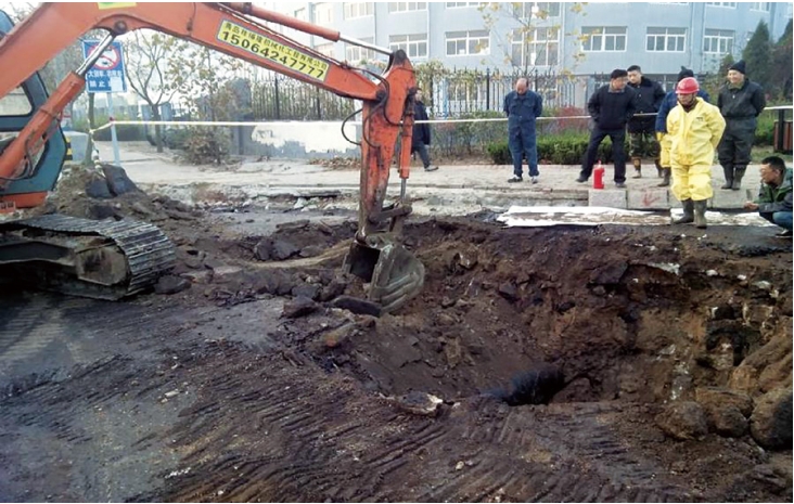 事故發(fā)生時(shí)秦皇島路正在進(jìn)行全面的翻修改造,據(jù)施工方介紹此次改造將原路面下挖半米,再重新做路基、鋪瀝青。在道路翻修過(guò)程中,施工方和管道業(yè)主方均未考慮地下管道的保護(hù)問(wèn)題。從現(xiàn)場(chǎng)看,路面下挖工作已經(jīng)完成,在搶修作業(yè)照片(圖 5)中可見(jiàn),管道直接埋在地下,大量泄漏的原油滲入土壤。管道上方覆土厚度約為0.7 m,路面開(kāi)挖、渣土運(yùn)輸對(duì)管道的碾壓和沖擊不可避免。