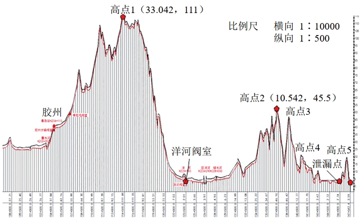 (2)停輸至洋河截?cái)嚅y關(guān)閉。從圖 9中可見(jiàn),高點(diǎn)1與泄漏點(diǎn)有超過(guò)100 m的高差,能造成泄漏點(diǎn)處0.8 MPa的管道內(nèi)壓,停泵后回流的原油從事故點(diǎn)以較高的壓力噴泄,關(guān)閉洋河閥室能避免高程大于高點(diǎn)2的管內(nèi)原油繼續(xù)泄漏,開(kāi)啟首站泄壓閥能回收部分從高點(diǎn)回流的原油。洋河閥室距黃島首站24.5 km,從停泵到關(guān)閥歷時(shí)66分鐘。