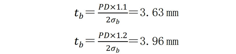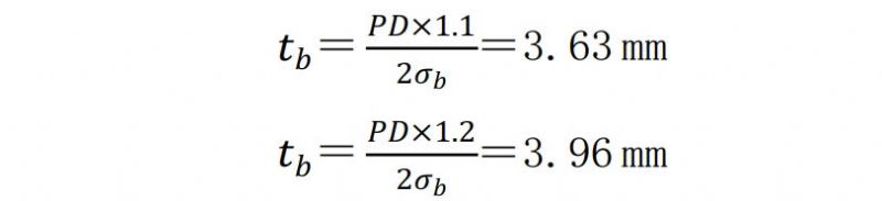 實際上,管道屈服以后管徑不斷增大。假設按管道10%和20%延伸率分別進行計算,則管道爆裂的剩余壁厚分別為: