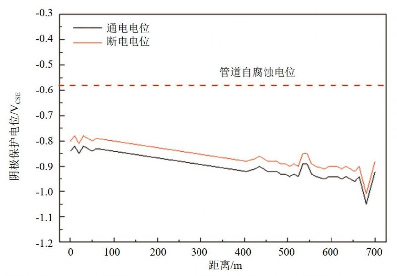 依據(jù)GB/T 21447―2008《鋼制管道外防腐控制規(guī)程》6.6.2、GB/T 21448―2008《埋地鋼制管道陰極保護技術(shù)規(guī)范》4.3規(guī)定。測試管道通電電位、斷電電位均滿足﹣0.85 VCSE的最小保護電位指標或100 mV極化偏移指標。因此判斷管道事故點西側(cè)殘留管段以西700 m范圍內(nèi)管道具備一定的陰極保護效果。