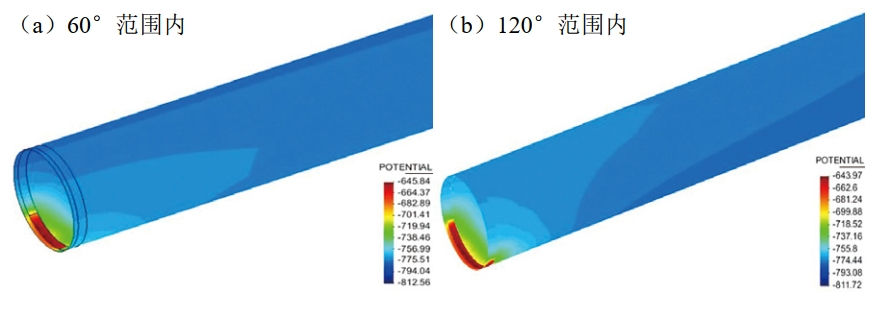 當防腐層破損處位于墻體內(nèi)側(cè)30 mm~90 mm,分別處于管道下方60°和120°時管道外表面電位分布如圖 6所示。