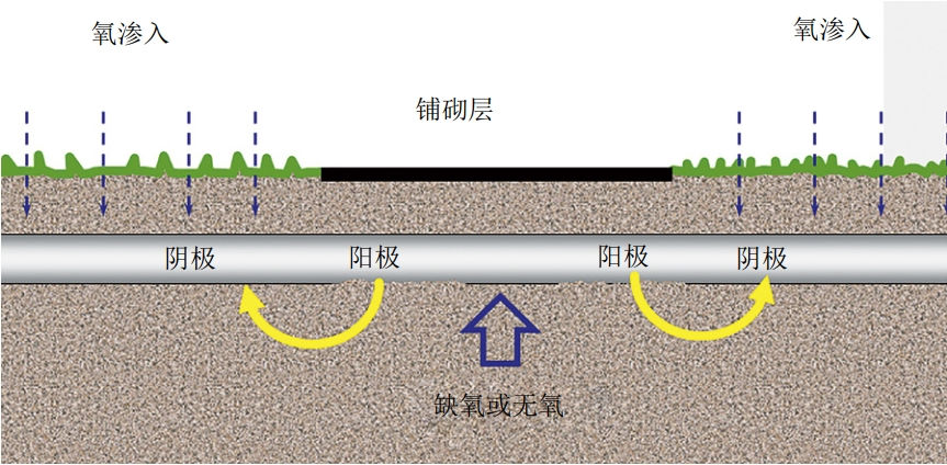 三是氧濃差電池導致管道距離墻體表面1 m之內(nèi)腐蝕嚴重。管體穿越墻體界面靠近排污暗渠側(cè)氧含量較高,靠近墻體側(cè)氧含量較低,會在局部形成氧濃差腐蝕電池,加速缺氧位置處的腐蝕,從而導致墻體內(nèi)側(cè)1 m范圍內(nèi)局部腐蝕嚴重。這個類似于穿越路面的管道由于氧濃差電池導致管道腐蝕,如圖 8所示。