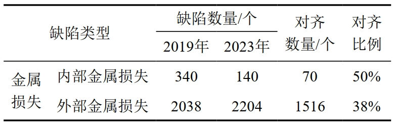 與附件特征對(duì)齊比例相比,本體缺陷對(duì)齊比例要偏低,主要原因?yàn)椴煌瑑?nèi)檢測(cè)承包商對(duì)缺陷的量化識(shí)別差異。針對(duì)未匹配的金屬損失分析,某缺陷2019年檢測(cè)被識(shí)別為焊縫異常,2023年識(shí)別為金屬損失,導(dǎo)致列表無法匹配(圖 3)。