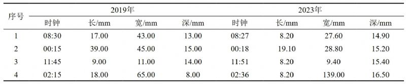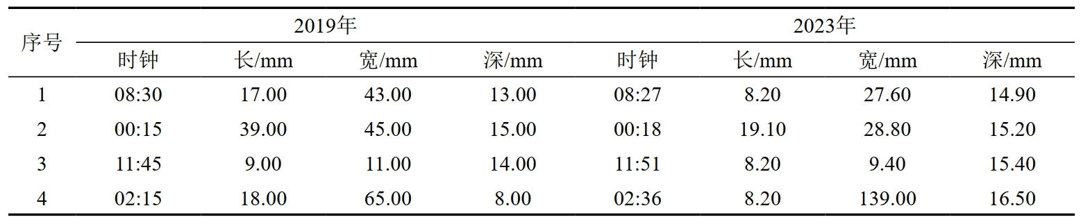 為了分析不同內(nèi)檢測(cè)商對(duì)缺陷尺寸的量化差異,本文選取了4處能夠匹配的缺陷進(jìn)行了數(shù)據(jù)對(duì)比(表 3)。分析可知,兩次內(nèi)檢測(cè)匹配缺陷時(shí)鐘方位之間的差異均較小。由于檢測(cè)器閾值及量化模型差異的原因,缺陷長(zhǎng)度、寬度及深度均存在一定差異,單純通過缺陷列表數(shù)據(jù)并不能確定缺陷實(shí)際增長(zhǎng)情況。在數(shù)據(jù)對(duì)比時(shí),可以通過列表觀察缺陷變化的趨勢(shì),并針對(duì)有較大變化的缺陷進(jìn)一步分析,提高比對(duì)效率。