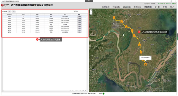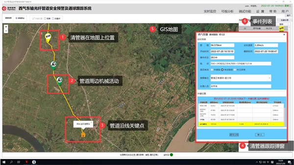 本次應用光纖預警系統(tǒng)跟蹤定位內檢測器,表明其能夠有效識別檢測器運行過程中外部環(huán)境因素產生的其他信號來源,客觀實時對事件有效告警,在跟蹤定位檢測器位置和運行時間上與現場實際運行參數誤差較小,具有參考性。同時,光纖預警系統(tǒng)能夠進行可視化提示且可復制性強,可以實現以下功能。