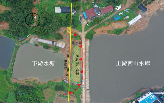 甬滬寧輸油管道于2004年建成投產,設計年輸油能力為2000×104 t,承擔著向揚子石化、金陵石化及長江上游各大煉化企業(yè)輸送原油的重要任務。該管道經過江蘇省句容市西山水庫堤壩東側坡腳,與大壩走向平行,埋深約1.5 m。西山水庫已建成約20年(圖 1),堤壩主體為人工填土堆筑形成,由于土質不均,松散欠密實,局部存在較大孔隙、空隙。水庫上游庫區(qū)護坡已存在較多凹陷、塌陷并形成管涌土洞,堤壩下游為地勢較低的水塘,土體常年飽水、滲水,坡面曾多次發(fā)生過淺表滑塌、小型滑坡。一旦發(fā)生較大或較深滑坡,將嚴重威脅管道運行安全。