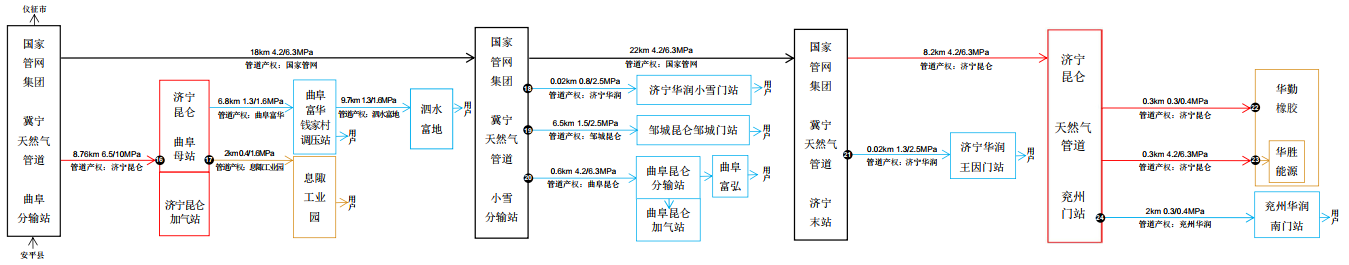 (2)對(duì)現(xiàn)狀進(jìn)行系統(tǒng)梳理。根據(jù)山東省安全生產(chǎn)工作任務(wù)分工和濟(jì)寧市行業(yè)安全生產(chǎn)主管部門(mén)和行業(yè)安全生產(chǎn)直接監(jiān)管責(zé)任部門(mén)分工要求,能源局以管道產(chǎn)權(quán)和設(shè)計(jì)規(guī)范為主要依據(jù),對(duì)天然氣長(zhǎng)輸管道和城鎮(zhèn)燃?xì)夤艿婪植记闆r摸底調(diào)查,繪制了管道分布示意圖(如圖所示),劃分出28個(gè)分界點(diǎn)。
