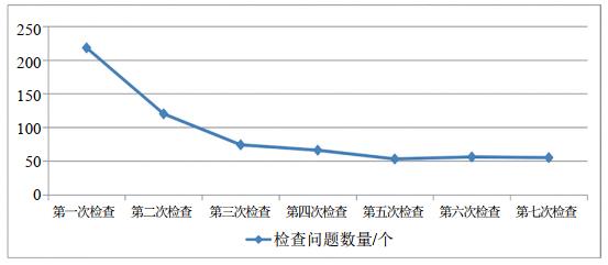 (3)管控成效。應(yīng)用帕累托圖法對(duì)影響焊接質(zhì)量的主要因素進(jìn)行重點(diǎn)管控,經(jīng)第七次焊接質(zhì)量檢查,累計(jì)問題項(xiàng)已降低至55個(gè),如圖 2所示。建設(shè)單位在未增加管理人員情況下,焊接質(zhì)量問題總體呈下降趨勢(shì),如圖 3所示。