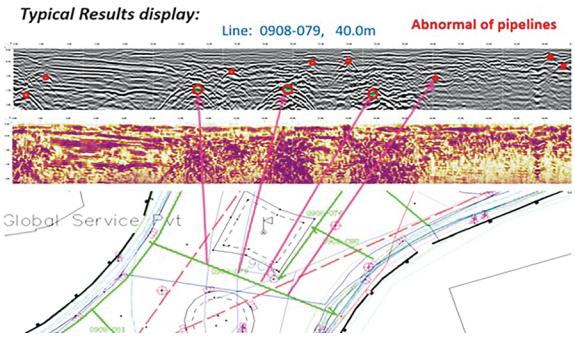 探地雷達(dá)設(shè)備價格昂貴,對實施探測的場地有較高要求,探測準(zhǔn)備工作比較繁瑣。探測效果與管道徑深比、地質(zhì)條件密接相關(guān),管徑越大、埋深越淺則探測效果越明顯,富水地區(qū)探測非金屬管道效果不理想,復(fù)雜環(huán)境下難以分辨和確認(rèn)目標(biāo)管道。探測結(jié)果解譯過程繁瑣,物探工程師需要較多的內(nèi)外業(yè)經(jīng)驗。實際工作中一般用于輔助管線探測,以及驗證判斷是金屬管道還是非金屬管道。