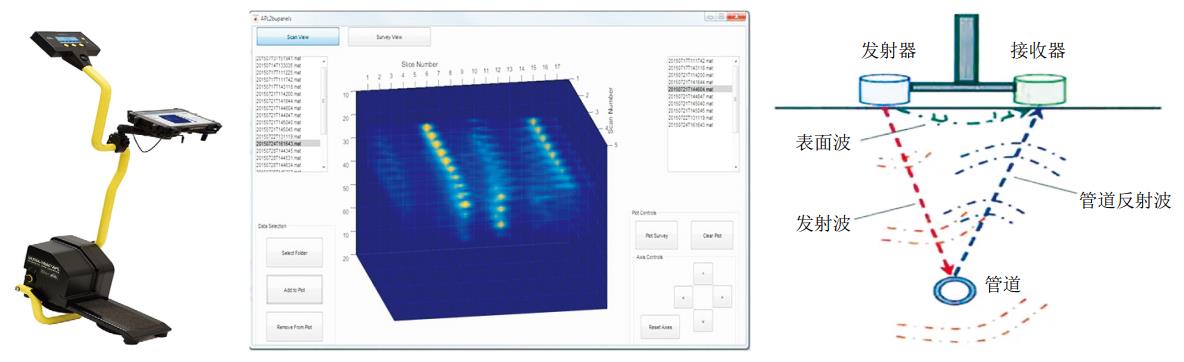 該方法多用于地下管線較少時的管道輔助探測,適用于全部淺埋金屬和非金屬管道,市政公用管道應(yīng)用較多。典型設(shè)備如美國杰恩公司APL聲學(xué)管線定位儀(圖 3)。其工作模式類似于探地雷達(dá),通過發(fā)射器向地面發(fā)射探測聲波(探地雷達(dá)是發(fā)射電磁波),接收器接收探測聲波的反射波,完成一次“斷面探測”,通過多次斷面探測記錄的反射波的強(qiáng)度、速度和持續(xù)時間等計算出地下管道的位置、管徑等信息。