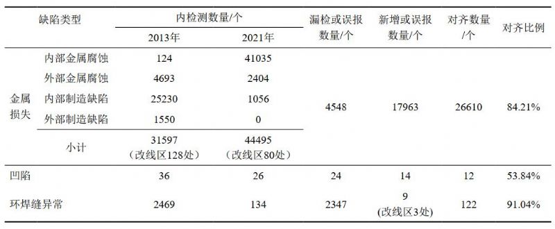 表 2 兩次內(nèi)檢測缺陷對齊結(jié)果