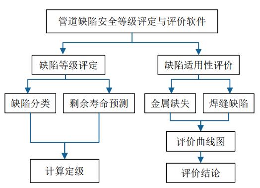 沈陽檢測技術(shù)分公司自行研發(fā)的管道缺陷安全等級評定與評價軟件V1.0集成了缺陷定級和評價兩大功能。依據(jù)TSG D7005―2018對金屬損失、焊縫缺陷等進行分類,根據(jù)缺陷類型輸入各缺陷相關(guān)參數(shù),可快速計算給出評級結(jié)果,以確定管道缺陷等級。依據(jù)SY/T 6477―2017 《含缺陷油氣管道剩余強度評價方法》,針對缺陷形式選擇推薦的缺陷評價方法,如管體腐蝕、表面金屬損失等缺陷,選擇體積型缺陷評價方法;焊縫裂紋、咬邊等缺陷,選擇裂紋型缺陷評價方法等。針對等級超標的缺陷,給出適用性評價的結(jié)論和建議。利用該軟件,能夠極大地提高缺陷評級的準確性和評價效率,為處置缺陷給出明確理論依據(jù)。軟件結(jié)構(gòu)框架與模塊功能如圖 1所示。