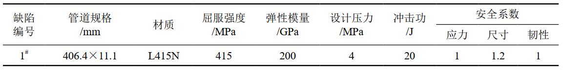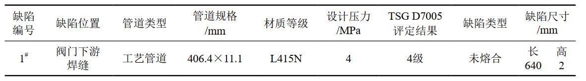 輸氣站場全面檢驗發(fā)現(xiàn)站內(nèi)工藝區(qū)某閥門下游焊縫處存在未熔合缺陷。管道及焊縫缺陷基本信息如表 2所示。