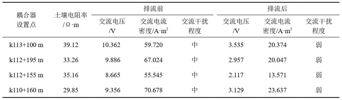 (1)管道穿越京滬高鐵等電氣化鐵路7處。與直供式電氣化鐵路交叉地段,應至少在交叉段的其中一側(cè)設置一處排流防護點。設計施工階段各穿越點一側(cè)設置了耦合器排流,用以排出流入管道的雜散電流。以京滬高鐵穿越為例,排流效果見表 1。結(jié)果表明,最大交流電流密度小于標準規(guī)定的30 A/m2,交流干擾程度判斷為弱。