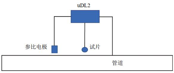 埋設(shè)試片時(shí)應(yīng)盡可能保證與管道埋深相同,若現(xiàn)場(chǎng)開(kāi)挖情況不允許,應(yīng)至少保證埋設(shè)深度為50 cm。便攜式參比電極盡可能靠近試片埋設(shè)。測(cè)試接線如圖 1所示。