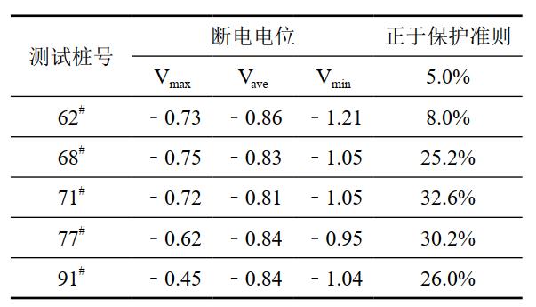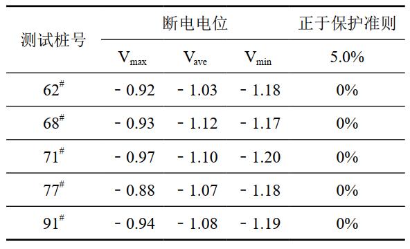 (2)電位檢測(cè)。排流治理后,再次對(duì)5處測(cè)試樁進(jìn)行24 h通/斷電位檢測(cè),陰保效果判定結(jié)果如表 2所示。
