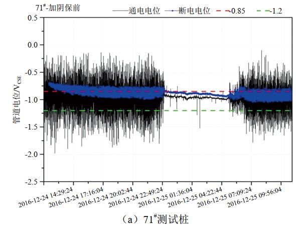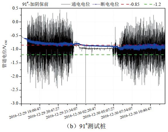 采用數(shù)據(jù)記錄儀(uDL2型)對(duì)管道24 h通/斷電位進(jìn)行檢測(cè),參比電極為銅/硫酸銅,斷電試片暴露面積為6.5 cm2、材質(zhì)為L(zhǎng)360。管道極化時(shí)間為1 h,通電周期設(shè)置為10 s,斷電周期1 s。