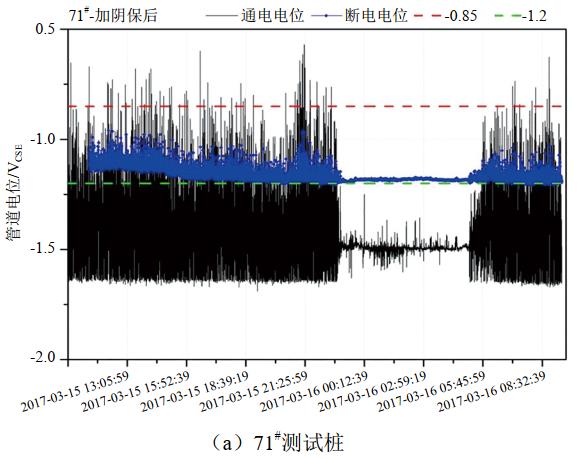 (3)通/斷電位波動(dòng)幅度分析。71#測(cè)試樁14:29至20:02通電電位波動(dòng)幅度為1.77 V(﹣2.00 VCSE~ ﹣0.23 VCSE),遠(yuǎn)大于同時(shí)段斷電電位波動(dòng)幅度0.33 V(﹣0.72 VCSE~﹣1.05 VCSE)。主要原因是受IR降波動(dòng)影響。測(cè)試通電電位是管道和參比電極之間的管地電位,測(cè)試回路中存在土壤電阻率、部分涂層電阻率,當(dāng)外界動(dòng)態(tài)雜散電流I波動(dòng)時(shí),IR通隨之波動(dòng)。測(cè)試斷電電位是斷電試片與參比電極之間的電位。雖然依舊存在動(dòng)態(tài)雜散電流I,但是由于斷電試片離參比電極足夠近,且無(wú)涂層,R斷遠(yuǎn)小于R通,則通電電位波動(dòng)幅度遠(yuǎn)大于斷電電位的。
