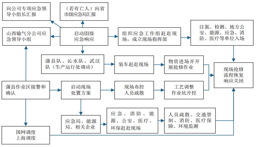 (1)實例。演練模擬西氣東輸西一線管道段ED030轉(zhuǎn)角樁處,發(fā)生天然氣泄漏(圖 1)。蒲縣作業(yè)區(qū)接到巡線工報警電話,立即啟動Ⅳ級應(yīng)急響應(yīng),報告西氣東輸山西輸氣分公司應(yīng)急領(lǐng)導小組、北京和上海兩級調(diào)度中心及屬地一平垣鄉(xiāng)人民政府,組織人員對事故地點進行檢測、警戒封鎖。分公司經(jīng)現(xiàn)場核實確認天然氣泄漏后,啟動Ⅲ級應(yīng)急響應(yīng),向公司應(yīng)急領(lǐng)導小組辦公室報告。經(jīng)勘察研究后,采取停輸換管方式對焊縫裂紋管道實施搶修,協(xié)調(diào)地方政府和應(yīng)急保駕單位支援。向國網(wǎng)、上海兩級調(diào)度申請工藝調(diào)整,對事故管段進行截斷放空。分公司同時組織現(xiàn)場勘查、環(huán)境監(jiān)測、預警監(jiān)控、進場道路鋪設(shè)、場地平整、臨時錨固安裝、索道架設(shè)、作業(yè)坑開挖、換管、地貌恢復等作業(yè)。