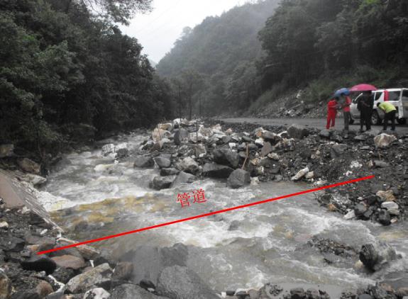 2010年7月,受連續(xù)大暴雨影響,關(guān)山溝泥石流爆發(fā),管道沿線水毀災(zāi)害十分嚴重,許多地段公路邊溝破壞、護岸擋墻垮塌、過水路面不復(fù)存在,有600米管段多處受損。其中A穿越河流處,原采用護岸墻+圓管涵水工保護工程防護,管堤受板橋溝洪水垂直沖刷嚴重,洪水中夾帶有大量塊石造成管堤處原有圓管涵堵塞,塊石直接沖擊管道上方已形成寬約10米、深約5米的豁口,6米長露管,表面防腐層局部破損(圖 1)。