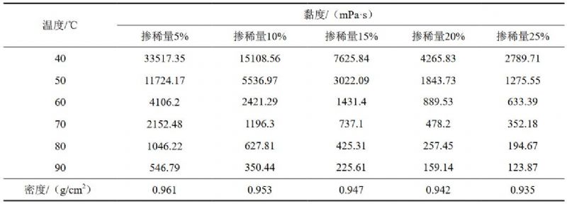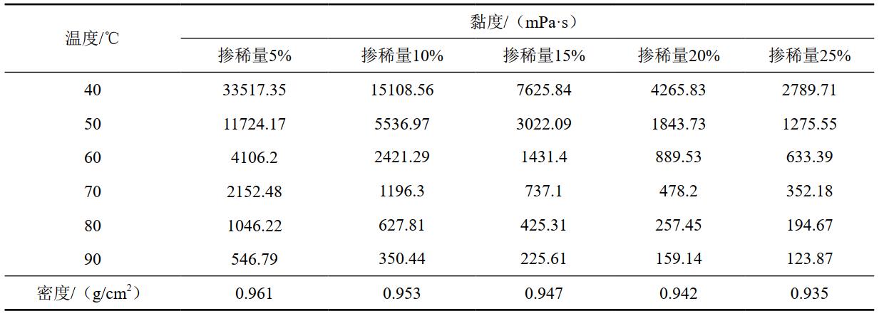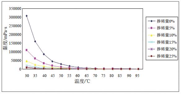 風(fēng)城稠油50 ℃時黏度為29113.99 mPa·s,屬于特稠油。隨著溫度升高黏度下降,其黏溫關(guān)系見表 1。由實(shí)驗得到摻入稀油量(摻稀量)5%、10%、15%、20%和25%的混合油品黏溫關(guān)系(表 2、圖 1)。可以看出:風(fēng)城特稠油摻入稀油后,黏度顯著降低,是一種較有效的降黏方法;隨著摻稀量增大,黏度降低的幅度減。划(dāng)摻稀量大于15%時,黏度降低效果相對不明顯;旌嫌推返拿芏入S著摻稀量的增大而減。ū 2)。