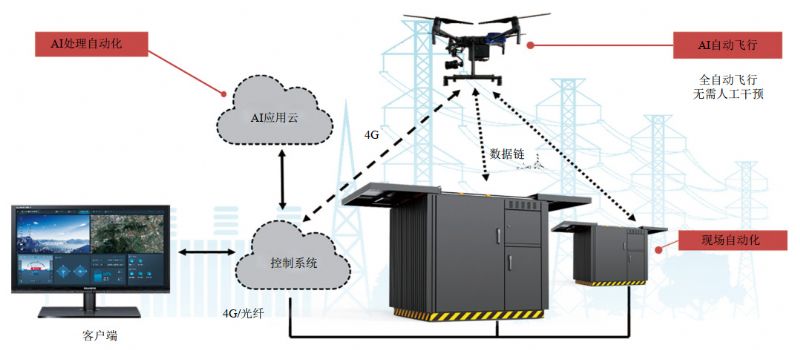 任務(wù)管理:在客戶端發(fā)布巡線任務(wù),無(wú)人機(jī)接收到4G信號(hào)指示后沿著設(shè)定的航線起飛、巡檢,到達(dá)50 km圖傳距離后進(jìn)入無(wú)人機(jī)停機(jī)坪充電,信號(hào)轉(zhuǎn)接。