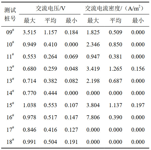 如表 2所示,分析9#~18#測試樁處交流電壓和交流電流密度,交流電壓最大值均小于15 V,交流電流密度平均值均小于30 A/m²,根據(jù)GB/T 50698―2011《埋地鋼質(zhì)管道交流干擾防護(hù)技術(shù)標(biāo)準(zhǔn)》評價,其交流干擾程度判定為“弱”。