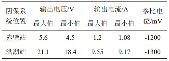 赤洪支線赤壁站和洪湖站各設(shè)置1套外加電流陰極保護(hù)系統(tǒng),兩站分別位于交叉穿越位置上游15 km、下游22 km,均采用恒電位模式運行,控制電位分別為﹣1200 mV(相對于CSE,下同)、﹣1300 mV,輔助陽極地床為淺埋高硅鑄鐵陽極,其接地電阻分別為4.0 Ω、1.4 Ω,采用萬用表測得通電電位分別為﹣1190 mV、﹣1305 mV。