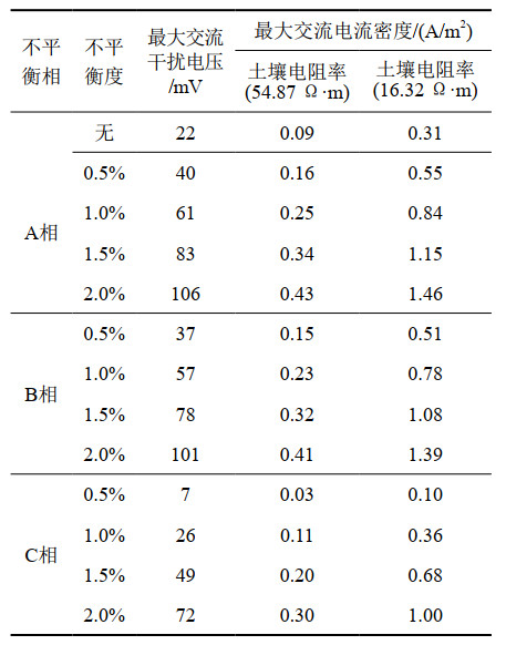 表 4 集電線路不同三相不平衡度時交流干擾計算結(jié)果