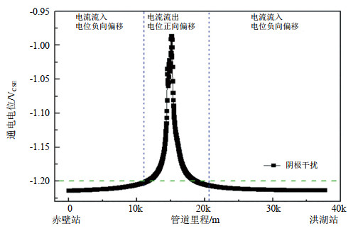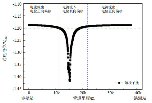 (2)直流干擾評價指標(biāo)。直流干擾對管道造成的主要危害為導(dǎo)致管道陰極保護(hù)電位無法滿足要求,影響管道陰極保護(hù)效果。根據(jù)GB 50991―2014《埋地鋼質(zhì)管道直流干擾防護(hù)技術(shù)標(biāo)準(zhǔn)》規(guī)定,當(dāng)存在直流電流入地時,管道極化電位應(yīng)滿足﹣0.85 V~﹣1.2 V。