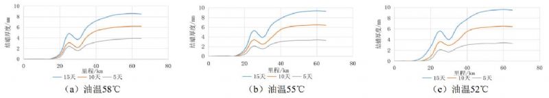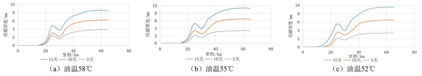 (1)不同出站油溫管道結(jié)蠟情況。分別選取高陽站出站油溫58℃、55℃和52℃,管道沿線地溫10℃,輸量100 m3/h,結(jié)合該管段每10天進(jìn)行一次清管現(xiàn)狀,分別模擬計(jì)算管道運(yùn)行5天、10天、15天的結(jié)蠟厚度。結(jié)果如圖 1所示。
