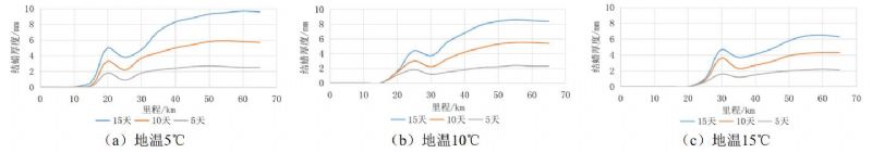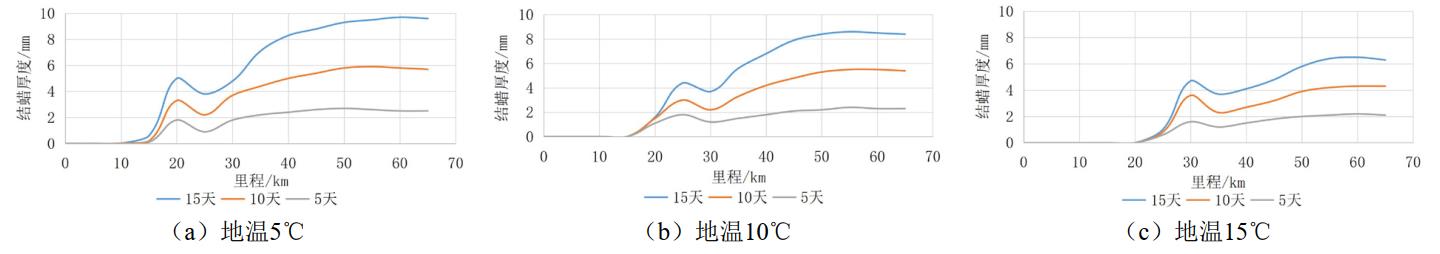 (2)不同沿線地溫管道結(jié)蠟情況。以高陽站出站油溫55℃,輸量100 m3/h,分別選取冬季管道沿線地溫為5 ℃、10 ℃、15 ℃,模擬計(jì)算管道運(yùn)行5天、10天、15天的結(jié)蠟厚度,結(jié)果如圖 2所示。
