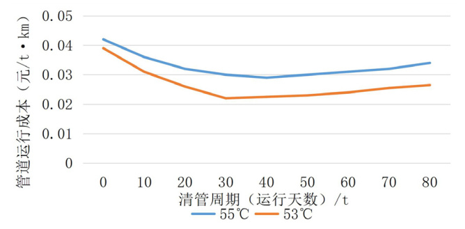 (1)考察不同出站油溫清管周期。分別選取高陽站出站油溫53℃和55℃,管道沿線地溫10℃,輸量100 m3/h,計(jì)算分析運(yùn)行天數(shù)(清管周期)對(duì)管道運(yùn)行成本的影響,結(jié)果如圖 3所示。