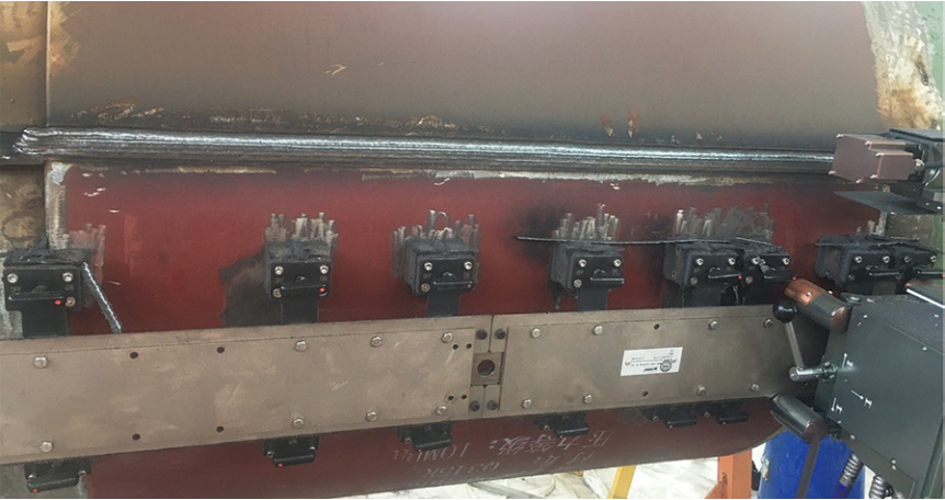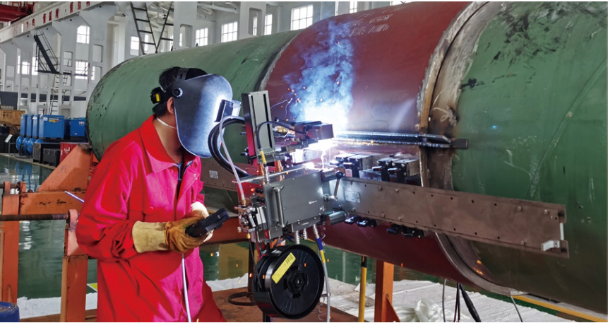 (2)條形缺陷。原因:焊槍的角度不合適,層間出現(xiàn)夾溝時(shí)未及時(shí)打磨平整,焊接電流過(guò)小。解決辦法:焊接每一道時(shí),調(diào)整好焊槍角度,熔寬搭接上一道焊縫的1/2左右,在焊接環(huán)角焊縫10點(diǎn)至2點(diǎn)鐘位置時(shí),容易出現(xiàn)較深的夾溝,應(yīng)適當(dāng)調(diào)節(jié)小車行走速度,減小擺寬,適當(dāng)增加焊接電流。