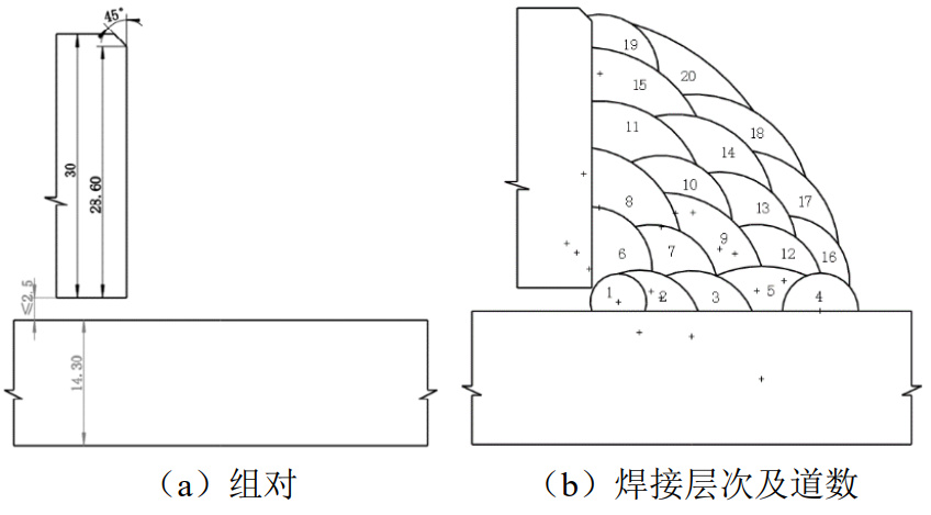 (1)組對(duì)、焊接層次及道數(shù)。環(huán)角焊縫組對(duì)如圖 3(a)所示,接頭形式采用環(huán)形搭接角焊縫,組對(duì)間隙不大于2.5 mm,焊腳尺寸40 mm×40 mm,焊接層次及道數(shù)如圖 3(b)所示。