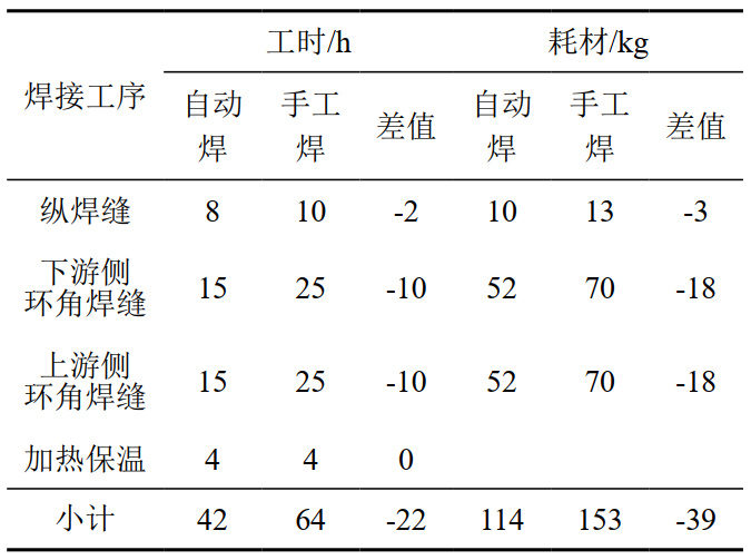 從所需工時(shí)、耗材兩等方面對(duì)比自動(dòng)焊接與人工焊接的差異,結(jié)果如表 3所示。